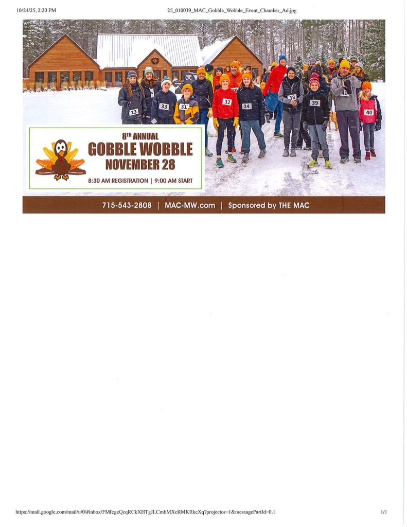 « All Events 8th Annual Gobble Wobble November 28 @ 8:30 am « Recycle Christmas Lights Thanksgiving Dinner at the Senior Center » Details Date: November 28 Time: 8:30 am Venue The MAC Manitowish Waters, + Google Map