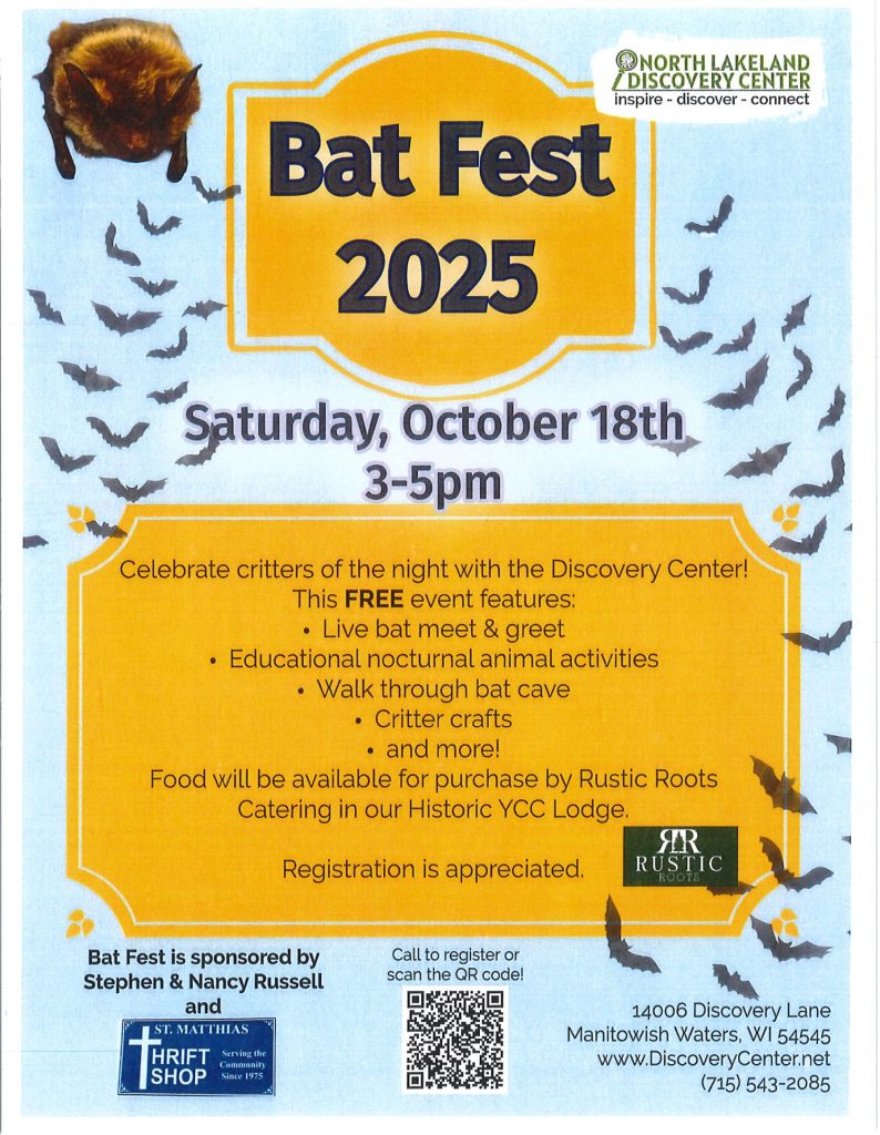 « All Events This event has passed. Bat Fest 2025 October 18, 2025 @ 3:00 pm - 5:00 pm « Mercer Musky Madness at Gateway Liberty Way Oktober Fest » Details Date: October 18, 2025 Time: 3:00 pm - 5:00 pm Venue North Lakeland Discovery Center 14006 Discovery Ln Manitowish, WI 54545 + Google Map Phone (715) 543-2085 View Venue Website