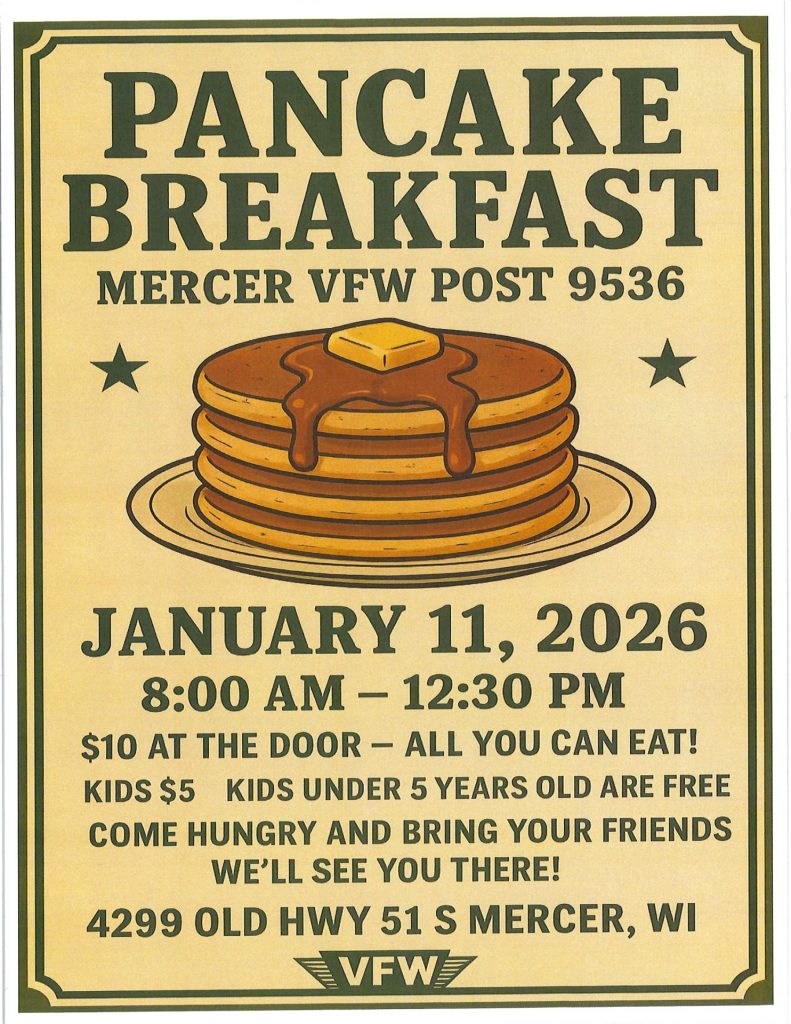 « All Events Pancake Breakfast at Mercer VFW Post 9536 January 11 @ 8:00 am - 12:30 pm « Mercer Sno-Goers Club Breakfast Recycle Christmas Lights » Details Date: January 11 Time: 8:00 am - 12:30 pm Venue Mercer VFW Post 9536 Organizer Mercer VFW Post 9536