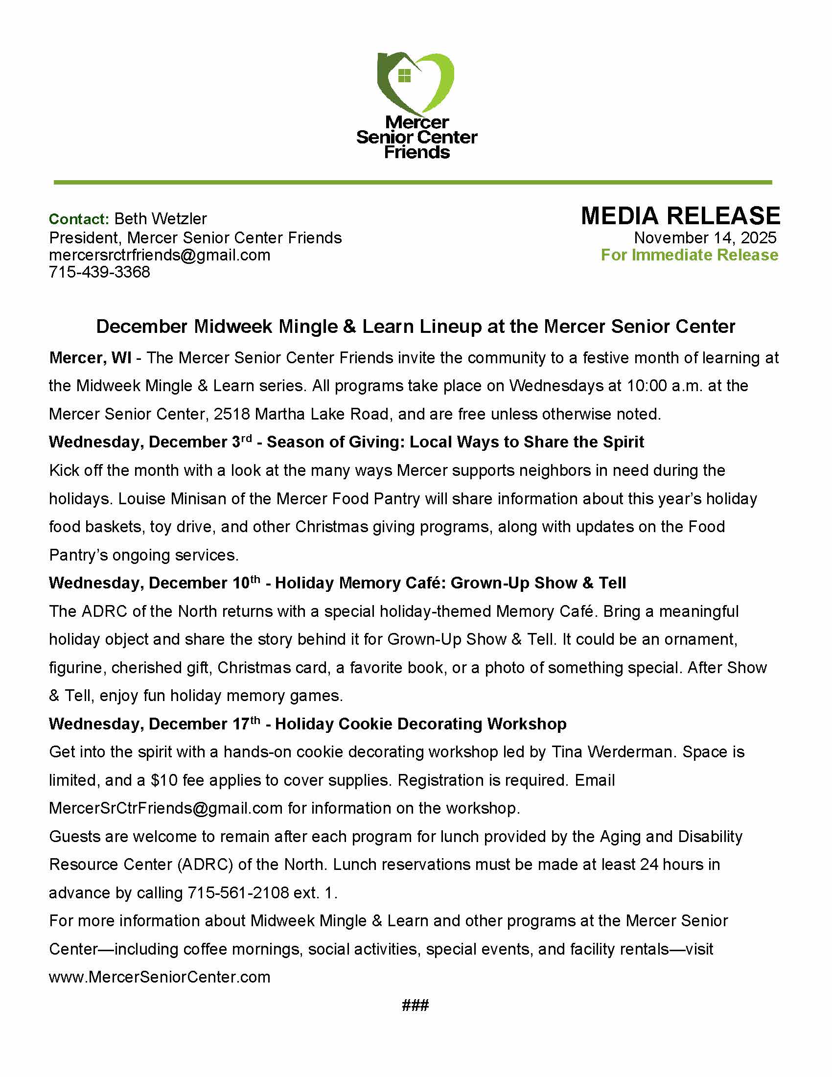 Midweek Mingle & Learn at the Senior Center Dec 3 10:00 am - 11:00 am Midweek Mingle & Learn at the Senior Center